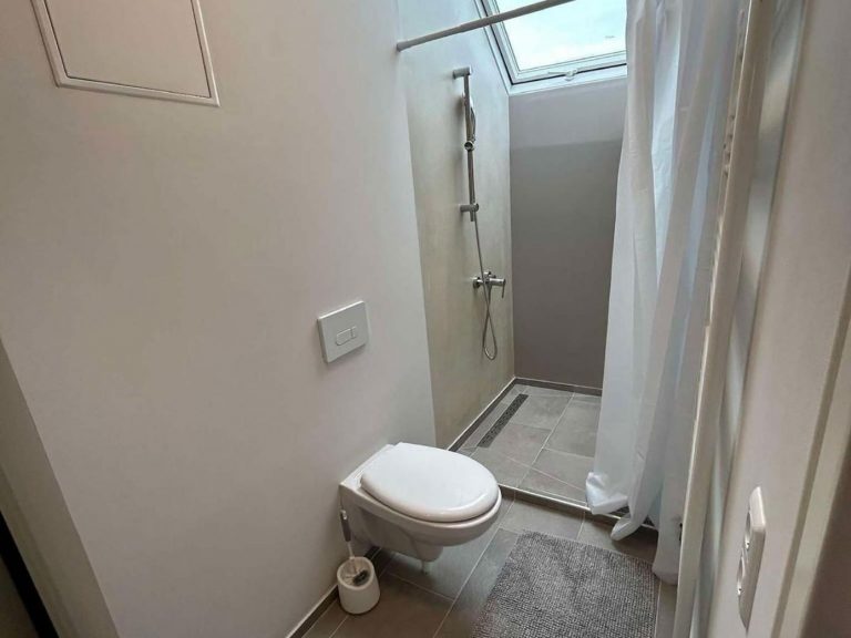 Zwischen den Zimmern ZeitReise / ZeitRaum befindet sich das helle Gemeinschaftsbad mit großer Dusche.